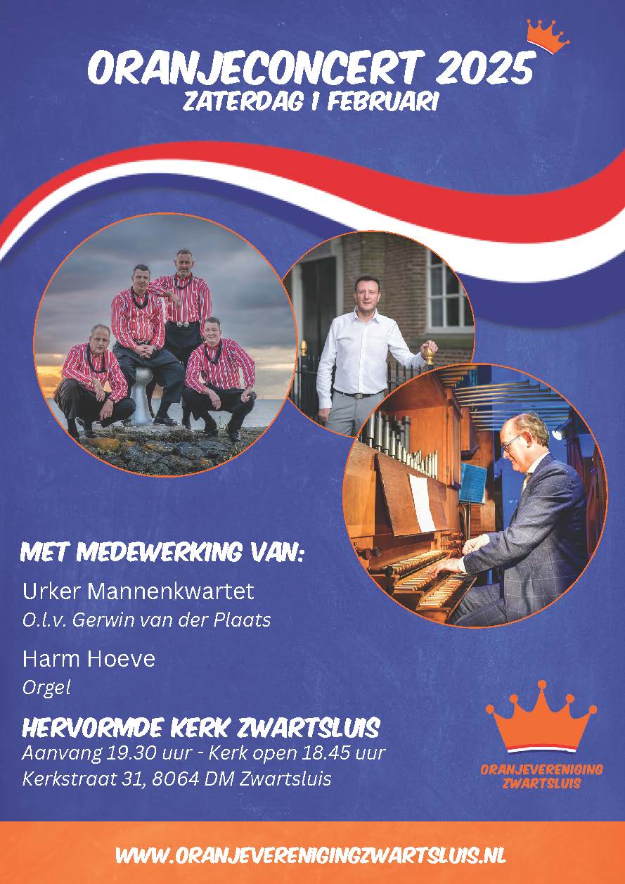 Oranjeconcert 1 februari 2025 19:3021:00 Herv. kerk Zwartsluis Kerkstraat 31, Zwartsluis, Netherlands Urker Mannenkwartet o.l.v. Gerwin van der Plaats Harm Hoeve, orgel
