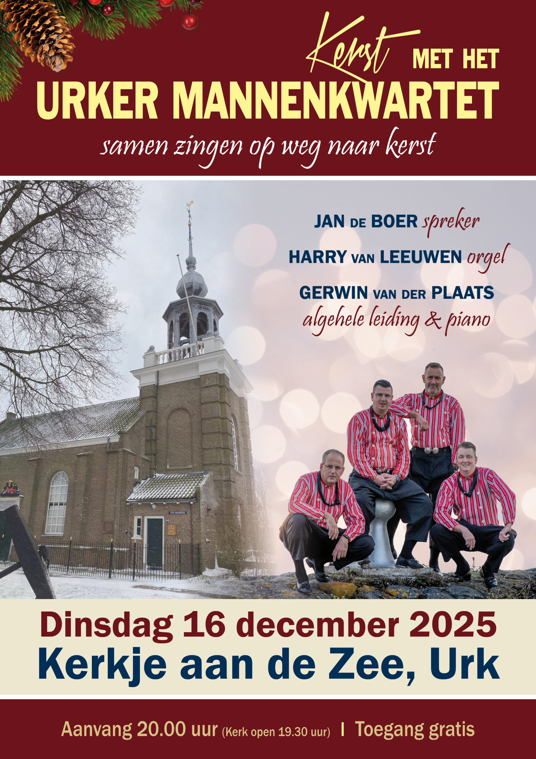 Kerst met het UMK 16 december 2025 20:0021:30 Kerkje aan de Zee Urk Prins Hendrikstraat 1, Urk, Netherlands Urker Mannenkwartet Jan de Boer, spreker Harry van Leeuwen, orgel Gerwin van der Plaats, alg. leiding